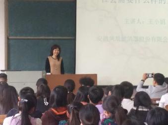 2015年10月21日下午,我院工商管理系举办了以“社会需要什么样的人才”为主题的管理实践讲座。本次讲座主讲人为安徽凤凰滤清器股份有限公司总经理王小娟,同时应邀出席的嘉宾有蚌埠女子第一站创始人、金业科技产业园董事长方雯、华东彩色印刷厂总经理吴海燕。工商管理系系主任梁中及部分师生参加,商学院副院长陈应侠主持讲座。
