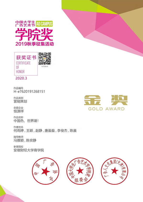 (图为17级广告专业学生凭借策划案《中国色,世界潮!》作品获得学院奖金奖)
