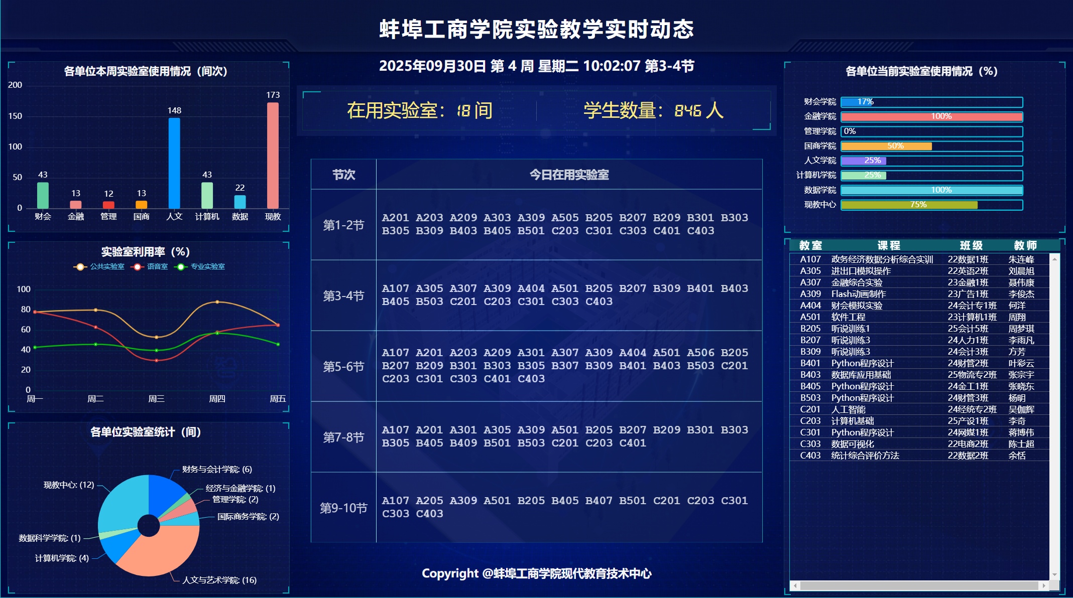 为直观地展示实验教学实时动态,更好地服务于实验教学保障工作,现代教育技术中心联合计算机与人工智能学院自主研发“蚌埠工商学院实验教学实时动态平台”,该平台依托数据可视化、AI数据分析等现代信息技术,与学校现有的智慧校园、教务管理等系统进行数据对接,构建了一个面向实验教学管理的实时动态与智能分析系统。目前,该平台已正式上线(网址:http://10.50.66.200)。