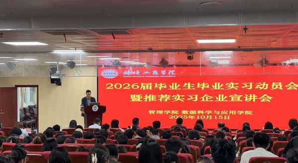 为扎实推进 2026 届毕业生实习就业工作,破解 “学生求职难、企业招才难” 的双向困境,进一步深化校企合作育人机制,10月15日下午,由管理学院、数据科学与应用学院共同主办的 “2026 届毕业实习动员会暨推荐实习企业宣讲会”在图书馆五楼报告厅和一层展厅顺利举行。学校副校长汪时珍,学生处副处长兼就业指导中心主任王玲,管理学院院长刘冬华、党总支书记阮进兵、副院长金诺,数据科学与应用学院院长徐勇、党总支书记刘根,两学院实习就业指导教师团队和10家优质企业代表,以及500余名毕业生参会,刘冬华主持会议。
