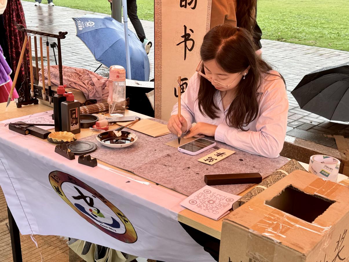 下午两点,校团委学生干部及各社团负责人已准备就绪。活动伊始,舞蹈社一段激情洋溢的开场表演瞬间点燃了现场气氛;吉他社的弹唱悦耳动人,引来观众惊呼连连;冰球轮滑社成员脚踏轮滑,灵活穿梭,展现出力与美的融合;徽韵书画社现场挥毫,墨香弥漫,笔走龙蛇;青藤手工社展示的DIY作品栩栩如生,令人赞叹;GZ动漫社的COSPLAY表演更是“圈粉”无数,将现场气氛推向高潮。学长学姐们热情讲解,配合各社团精彩的展示,共同绘就了秋日校园里一道生动而亮丽的风景线。