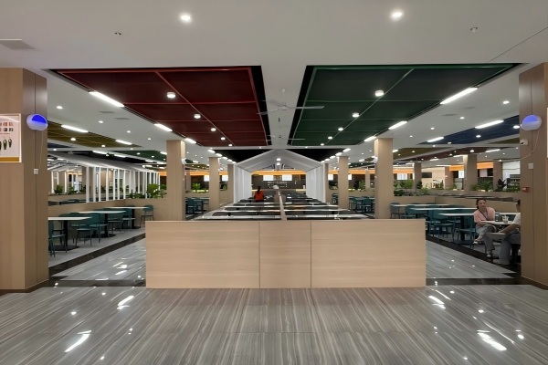 “骏韬厅”位于学校图书馆西侧,与15-18号学生宿舍楼相邻。步入一层大厅,宽敞整洁的环境令人眼前一亮,售餐区、用餐区功能划分清晰,装修美观大方,风格清新淡雅,充满青春活力的气息。供餐方面,充分考虑师生口味偏好,不仅保留了传统大众菜肴,还精心引入阿意味道、棒棒鸡、有家面馆等地方特色美食,丰富了师生们的用餐选择;出餐方面,采用透明操作台,配备电子叫号系统,有效减少排队时间。