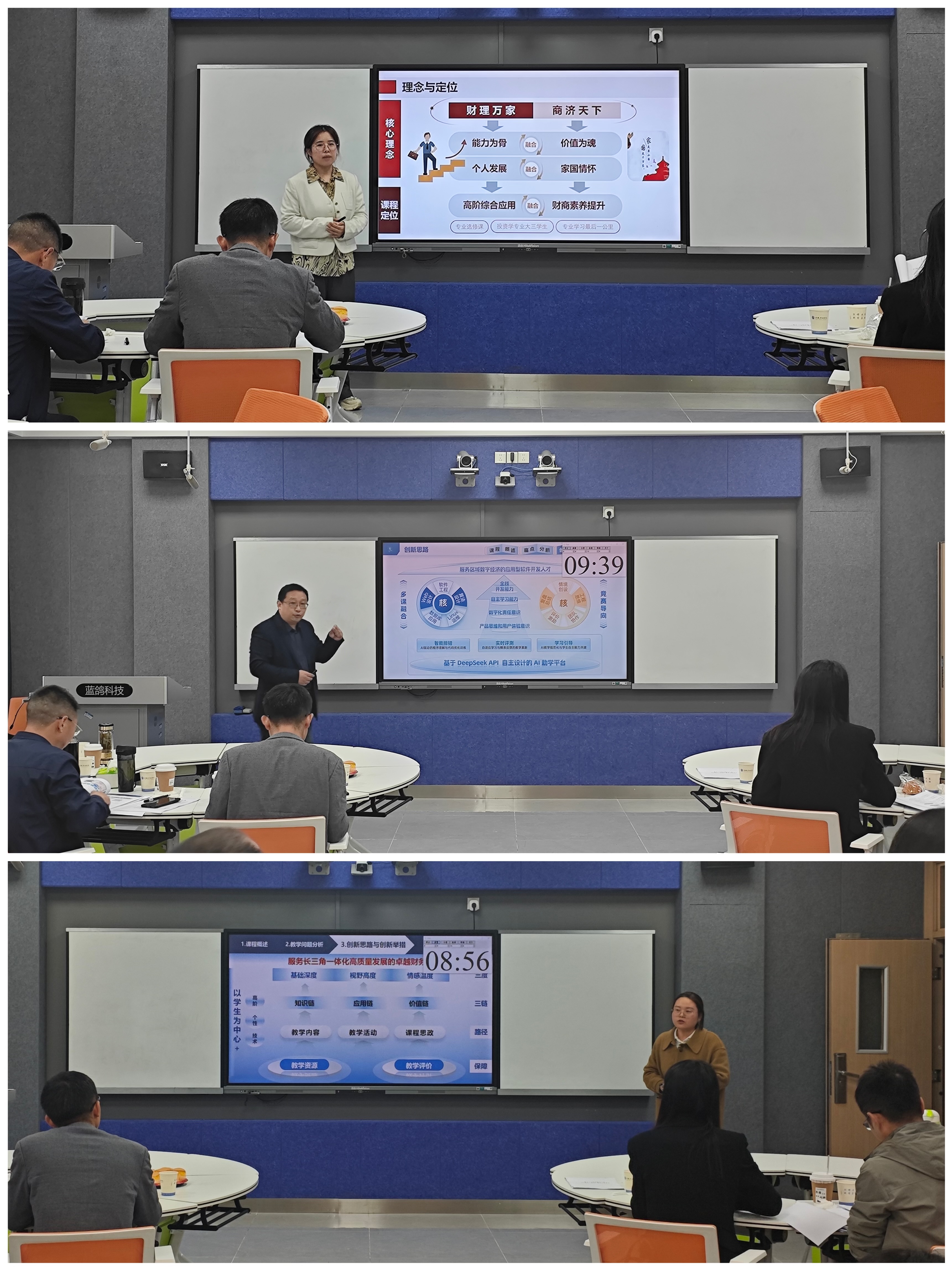 本次模拟赛严格对标正式比赛流程,参赛选手依次进行15分钟教学创新报告展示。在汇报环节中,我校周翔、王晓敏、仇艳三位教师依次登台,凭借扎实的专业基础、清晰的教学思路和富有感染力的现场表现,赢得了现场专家的高度关注。周翔老师以“双核驱动、AI赋能”为理念,推进教学内容与方法创新,深入挖掘思政元素,并将AI技术融入教学全过程,实现了知识传授与价值引领的有机统一;王晓敏老师深度探索“一核三径双环”财商育人模式创新实践,通过AI赋能下的具身体验式项目设计,系统破解当代大学生财商素养提升难题,充分体现新文科“以人为本、交叉赋能、学科融合”的教学理念;仇艳老师紧密结合学科前沿,通过课程结构重构、教学活动优化与课程思政有机融入,构建“三链三育”创新模式,实现知识链贯穿、应用链拓展与价值链融生,汇报逻辑严谨、内容生动。三位教师精神饱满、沉着自信,全面展现了我校教师优秀的专业素养与昂扬的精神风貌。