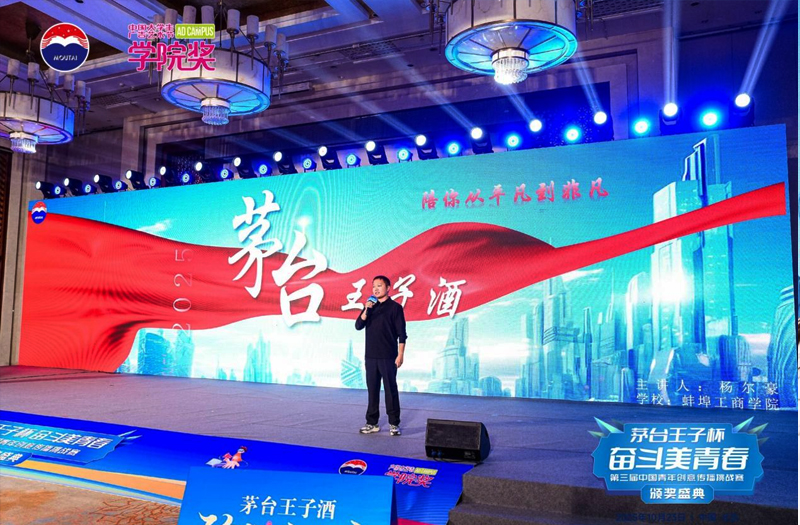 中国大学生广告艺术节学院奖是国内唯一由国家市场监督管理总局批准、中国广告协会主办的大型大学生广告艺术类赛事。学校看重竞赛的专业性、真实性与平台性,不仅在课程中融入学院奖获奖作品作为案例与作业,还积极探索“竞赛+实践”的专业教学模式、引导学生理解企业真实传播需求、在亲身实践中探索真知。人文与艺术学院连续多年组织学生参与竞赛,作品类型覆盖文案、平面、影视、微电影等,多次斩获恒源祥、毓婷、快克等多个命题单元的全国等级奖,有效支撑起广告这一传统专业的改造革新。在本届青年创意传播挑战赛中,茅台王子杯品牌希望实现品牌精神的年轻化,要求产品融入青年生活场景。杨尔豪同学以精准有效的洞察和简洁有力的文案,虽只有寥寥数笔,却刻画出青年一代的奋斗之美、展现了追求卓越的价值理念。