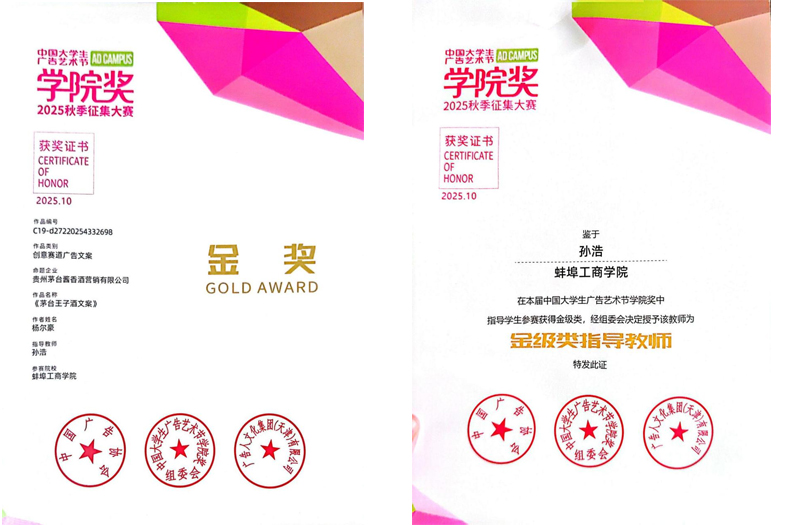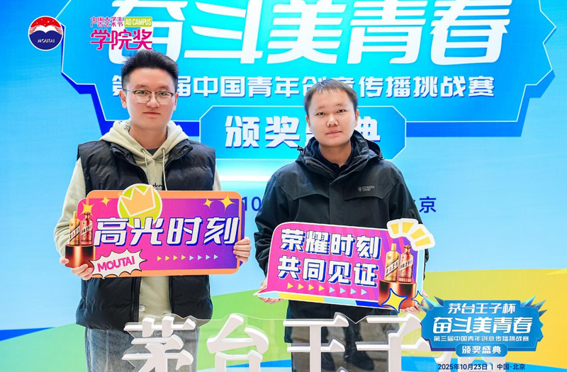 10月23日,第三届中国青年创意传播挑战赛“青春盛典”颁奖礼在北京天泰宾馆举行。人文与艺术学院24级广告专班学子杨尔豪凭借文案作品“茅台王子酒,陪你从平凡到非凡”从众多作品中脱颖而出、成功斩获茅台王子酒竞赛单元的国家级金奖。组委会为指导教师孙浩颁发“金级类指导教师称号”。师生共赴北京颁奖现场、共庆专业教育的高光时刻。
