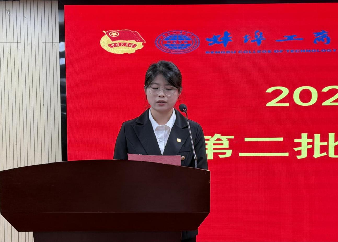 高宇为2025年新发展团员代表佩戴团徽,全体新团员面向团旗,高举右拳,庄严宣誓。铿锵有力的誓言响彻报告厅,展现蚌工商青年学子的青春力量和责任担当。