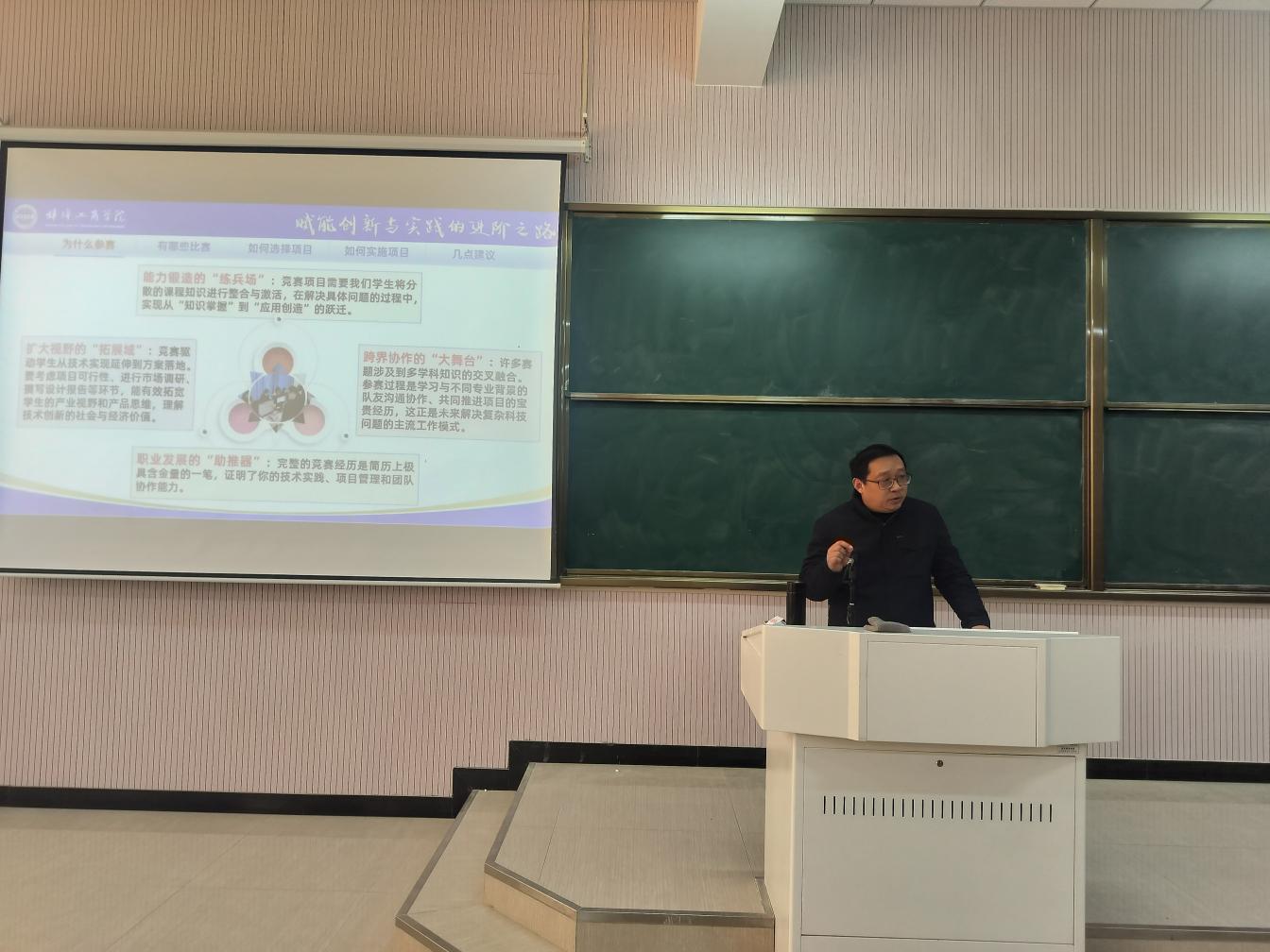 随后,周翔老师做了“赋能创新与实践的进阶之路”主题讲座,主要围绕为什么要积极参赛、计科专业学生相关的主要赛事、如何选择项目、如何实施项目等方面展开讲授。周老师指出,备赛一定要提前谋划,提前三个月甚至一年来打磨。对于选题,要特别注意一些共性,即紧扣国家战略与社会需求,注重特定需求、细分场景;要有很强的产品化思维;“AI+专业场景”已经成为主流;作品形态要高度注重“平台化、系统化、全链路”,并为同学们提供了2026年参赛选题建议。对于项目实施,要组建结构合理、优势互补的团队,注意引外智,跨学科组队;注重项目前期规划,过程中注重“技术创新+专业场景+工程深度”高阶融合;作品打磨要精益求精,注重呈现;在整个备赛过程中要相互鼓劲,妥善处理意见分歧,拥抱过程。最后他给同学们提供了几点建议,一是他山之石,可以攻玉,注重在各大网络平台搜索相关竞赛资料;二是博观约取,厚积薄发,平时就要注重观察、学习和积累;三是功不唐捐,玉汝于成,我们努力付出了,不论成功与否,都是我们成长的宝贵积淀。