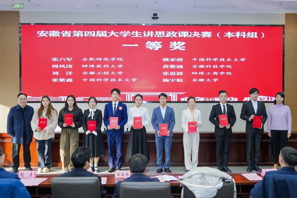 2025年12月27日,安徽省第四届大学生讲思政课决赛在安徽芜湖落幕。我校人文与艺术学院2022级学生张思源凭借《毛泽东思想活的灵魂——群众路线》,斩获决赛本科组一等奖,团队指导教师康薇薇、张起跃获“优秀指导教师”荣誉。