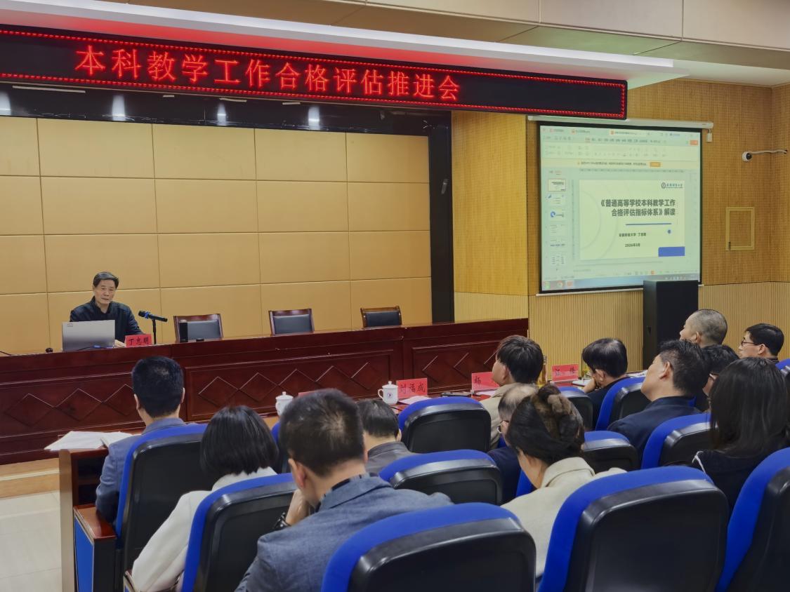 会上,刘福成校长围绕评估指导思想、工作意义、当前形势与差距、责任落实等方面作动员部署讲话。他深刻阐明合格评估对学校生存发展的极端重要性,系统解读了“四个促进、三个基本、两个突出、一个引导”核心内涵与“二十字评估方针”,客观分析我校在办学条件、师资队伍、教学管理等方面存在的短板,从“深学细研指标、凝聚工作合力、压实主体责任、振奋攻坚精神”四个方面提出明确要求。他强调,各学院、各部门要立足全局、紧盯时限,将任务分解到人、责任落实到岗,全力以赴推动各项评建工作落地见效。