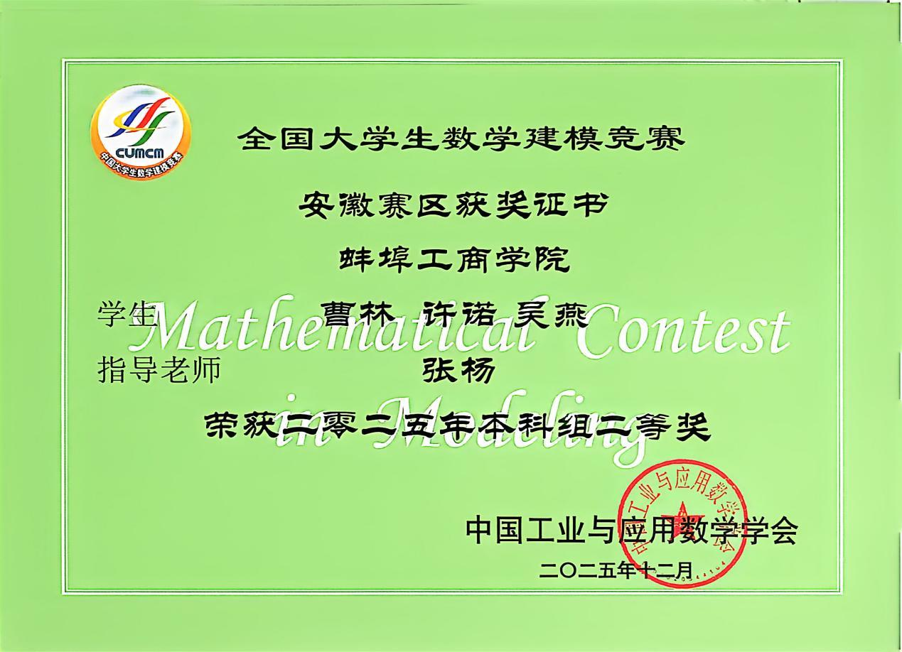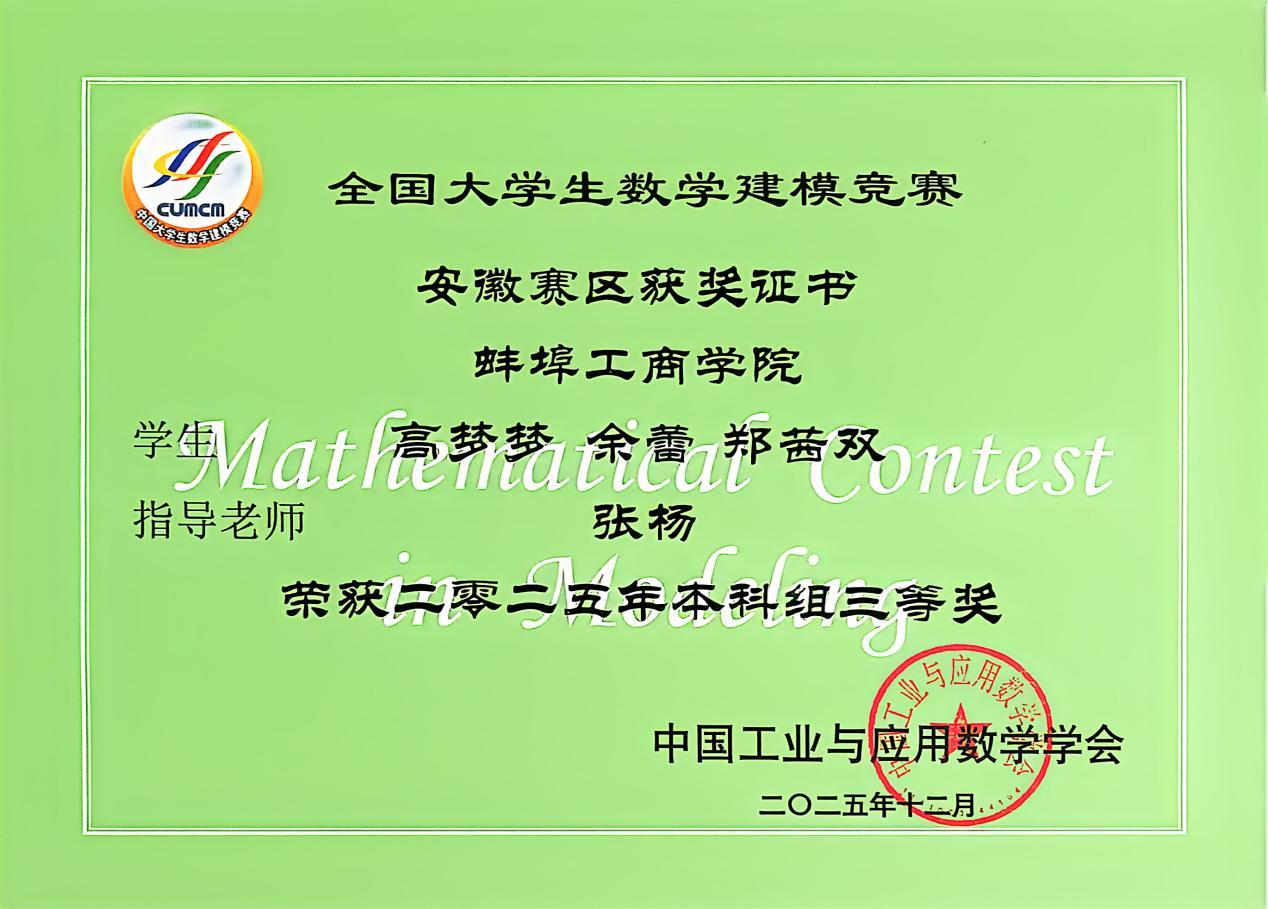 2025年“高教社杯”全国大学生数学建模竞赛安徽赛区竞赛成绩揭晓。在本次大赛中,由数据科学与应用学院张杨老师指导的23级经济统计学专业曹林、许诺,23金融工程学专业吴燕组成的代表队,荣获安徽省二等奖;由23级经济统计学专业高梦梦、23级计算机科学与技术专业余蕾、23级市场营销专业郑茜双组成的代表队,荣获安徽省三等奖。